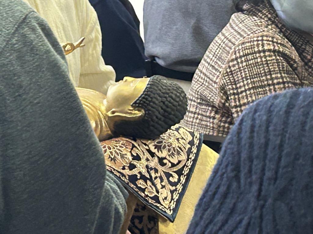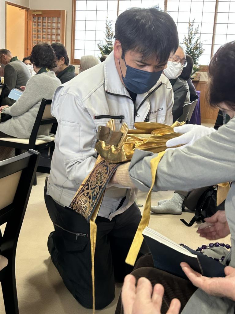 お仏壇の長谷川のサポートのもと、阿弥陀様には外陣の一角に遷座していただくことになり、内陣から阿弥陀さまがご門徒さんの手から手をつたって遷座された。